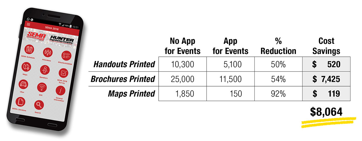 In 2018, Hunter introduced a mobile app for our largest, Corporate-hosted event - the National Sales, Service, and Distributior Meetings. This new app helped to greatly reduce printed material and overall cost.