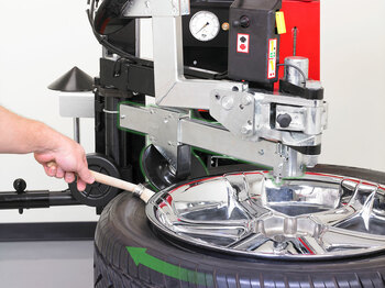 Swing arm clears from the work area and can return to rim edge easily. Locks rim diameter and width measurements to service same-sized wheels. 30% Smaller than tilt-back designs.