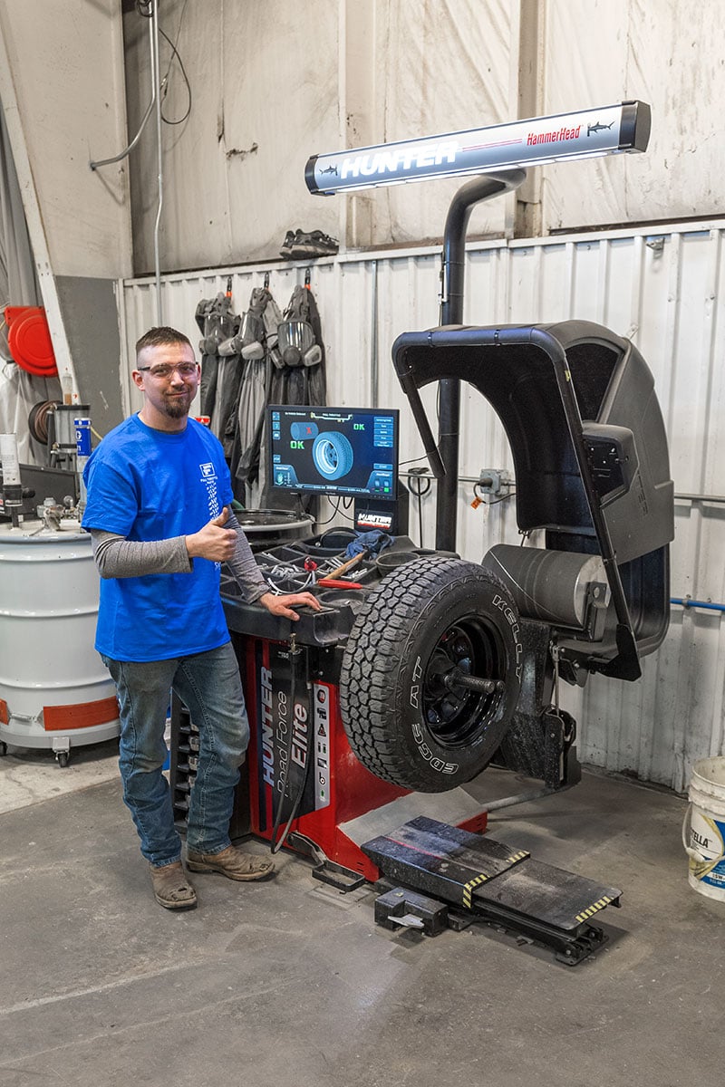 service reps and customer smiling and standing by alignment system