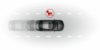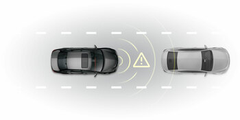 The AEB function detects an impending forward crash with another vehicle and applies brakes in time to avoid or mitigate the crash.